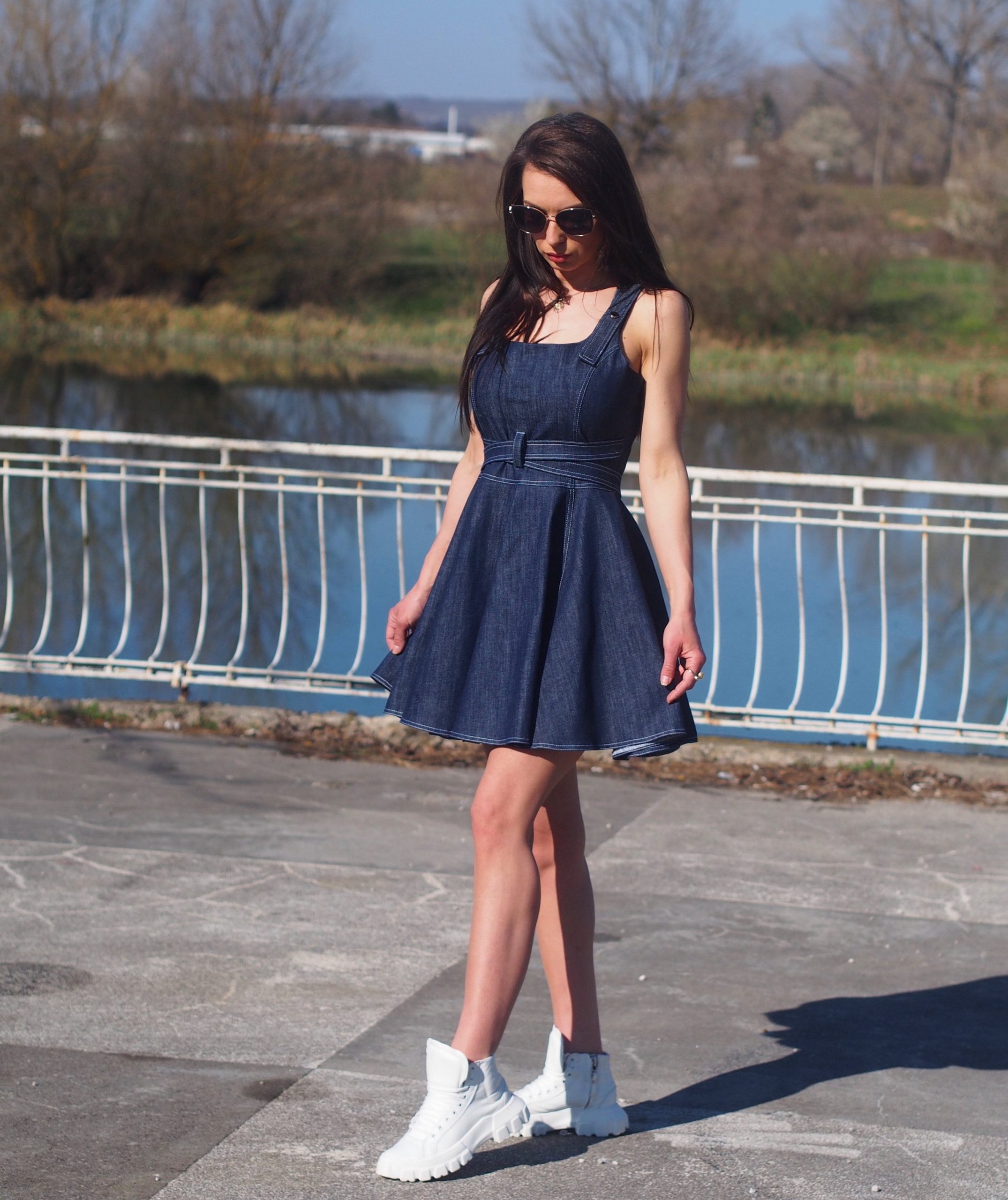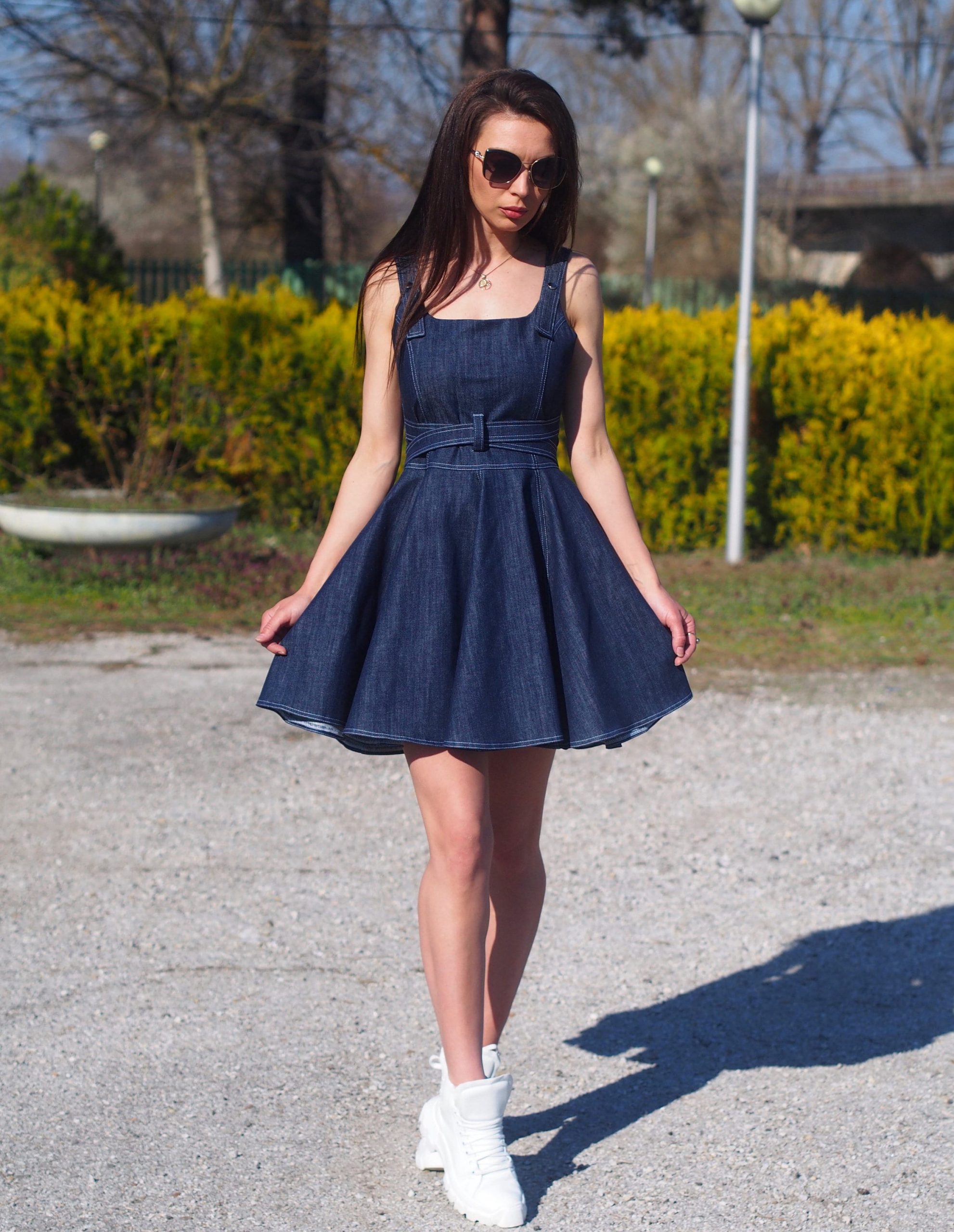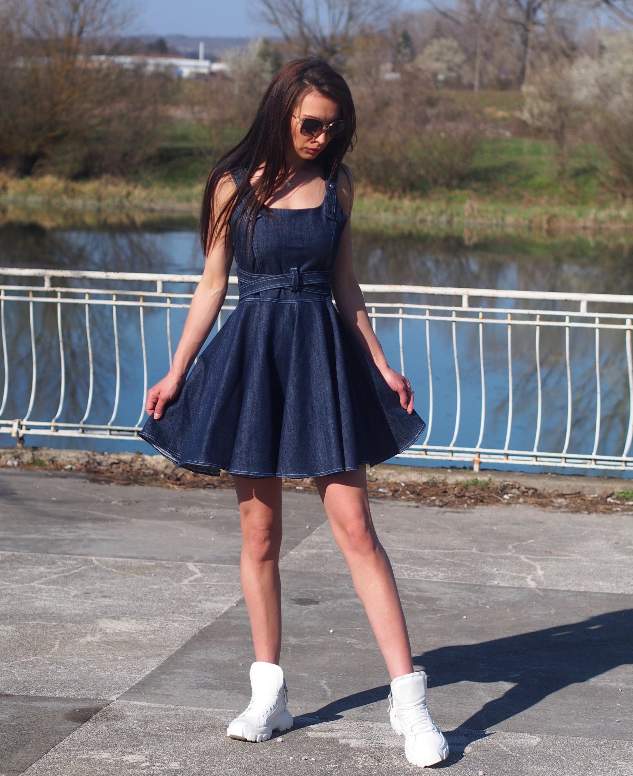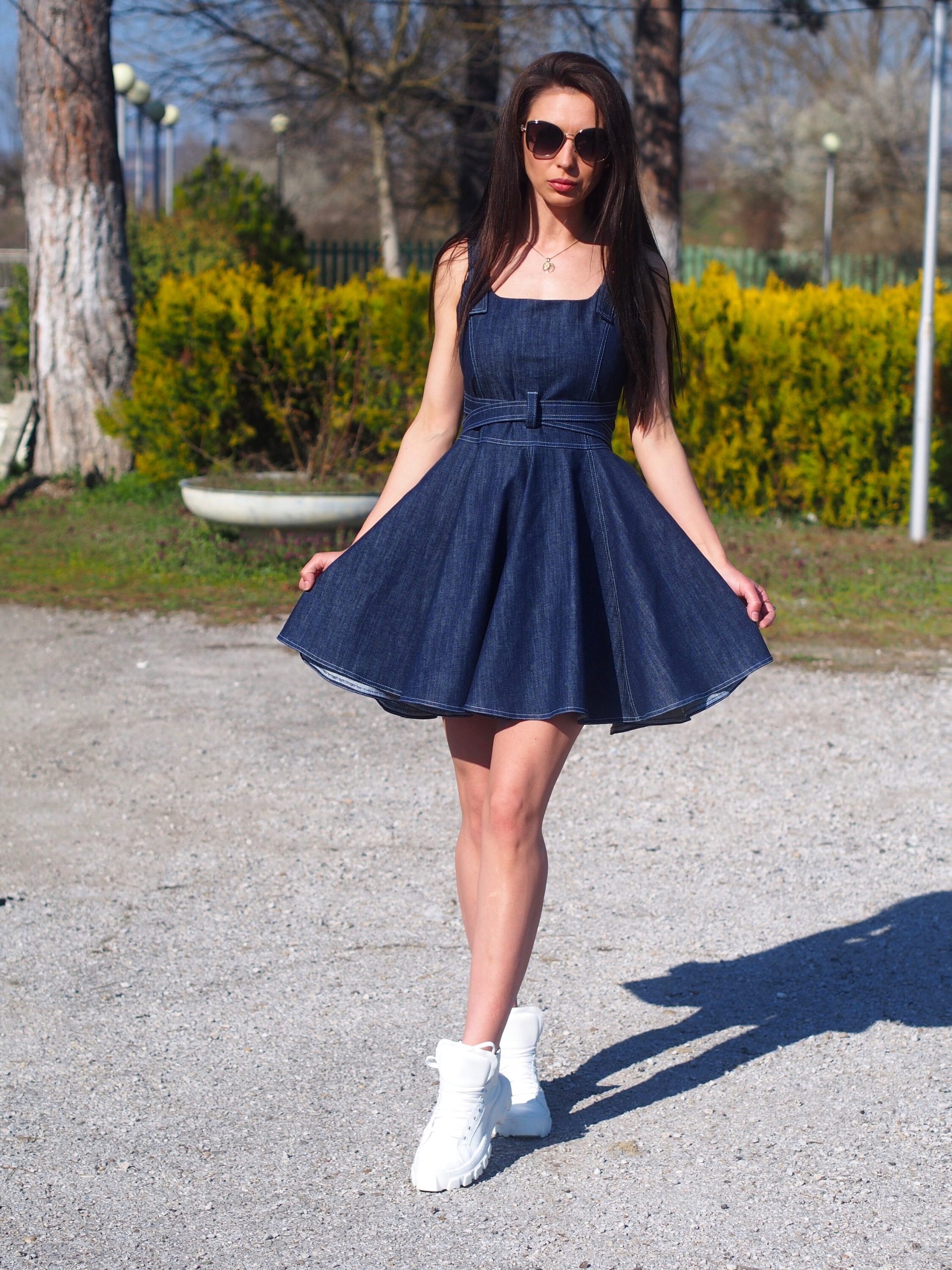 Features: Sleeveless, detachable denim belt, flared skirt